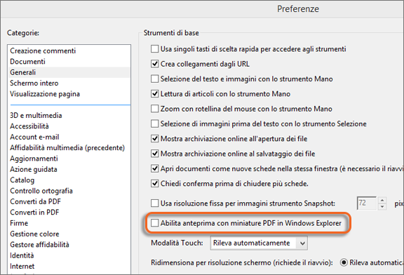 - Nella finestra di dialogo Preferenze, selezionare Generali dall’elenco delle categorie, quindi selezionare la casella Abilita anteprima con miniature PDF in Windows Explorer.